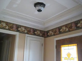 So this is what it looked like when we moved in, post ceiling scrape. The lady who lived here before REALLY loved Texas things. There was star and cowboy shit everywhere! And again with the peach walls! So we scraped off the cowboy hat border, repainted and changed the light fixture first thing.